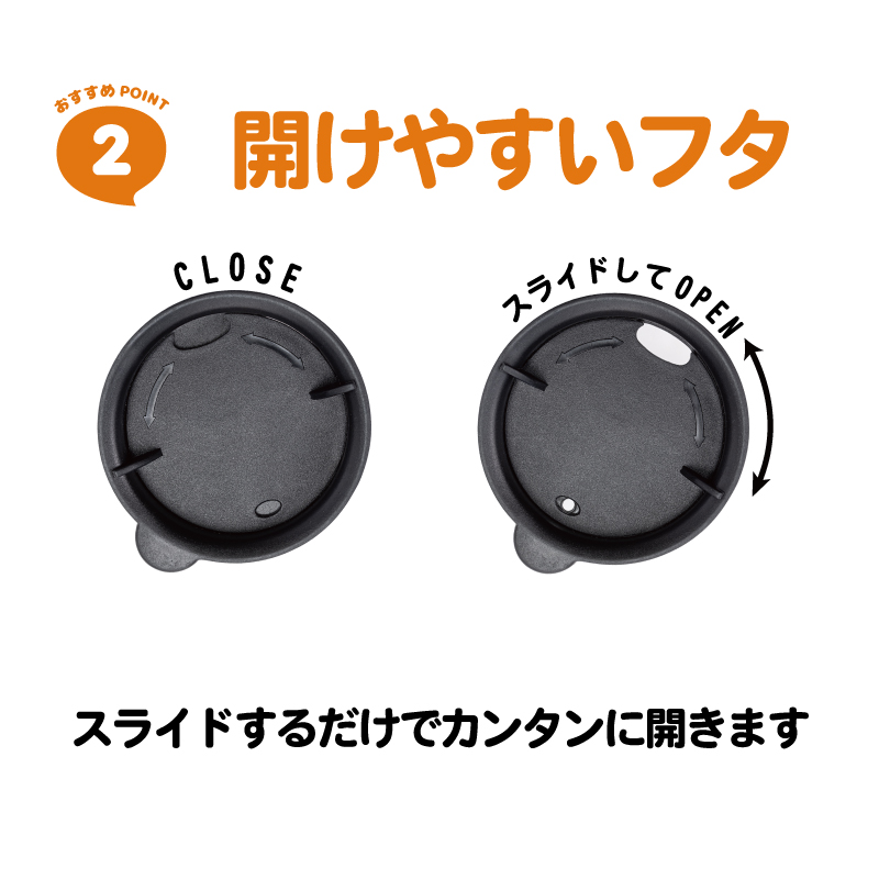 豊富なカラーバリエーションが嬉しい中空タンブラー。スライドするだけで簡単にフタの開閉ができます。