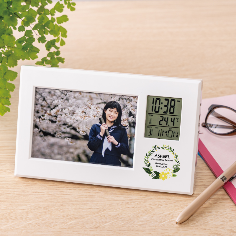 定番サイズのL判写真が入る時計付フォトフレーム。