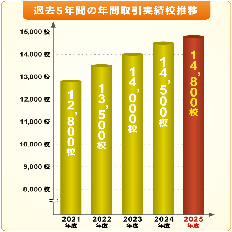 2025年度は全国約14,800校の学校様より弊社の商品およびサービスをご利用頂きました。心よりお礼申し上げます。